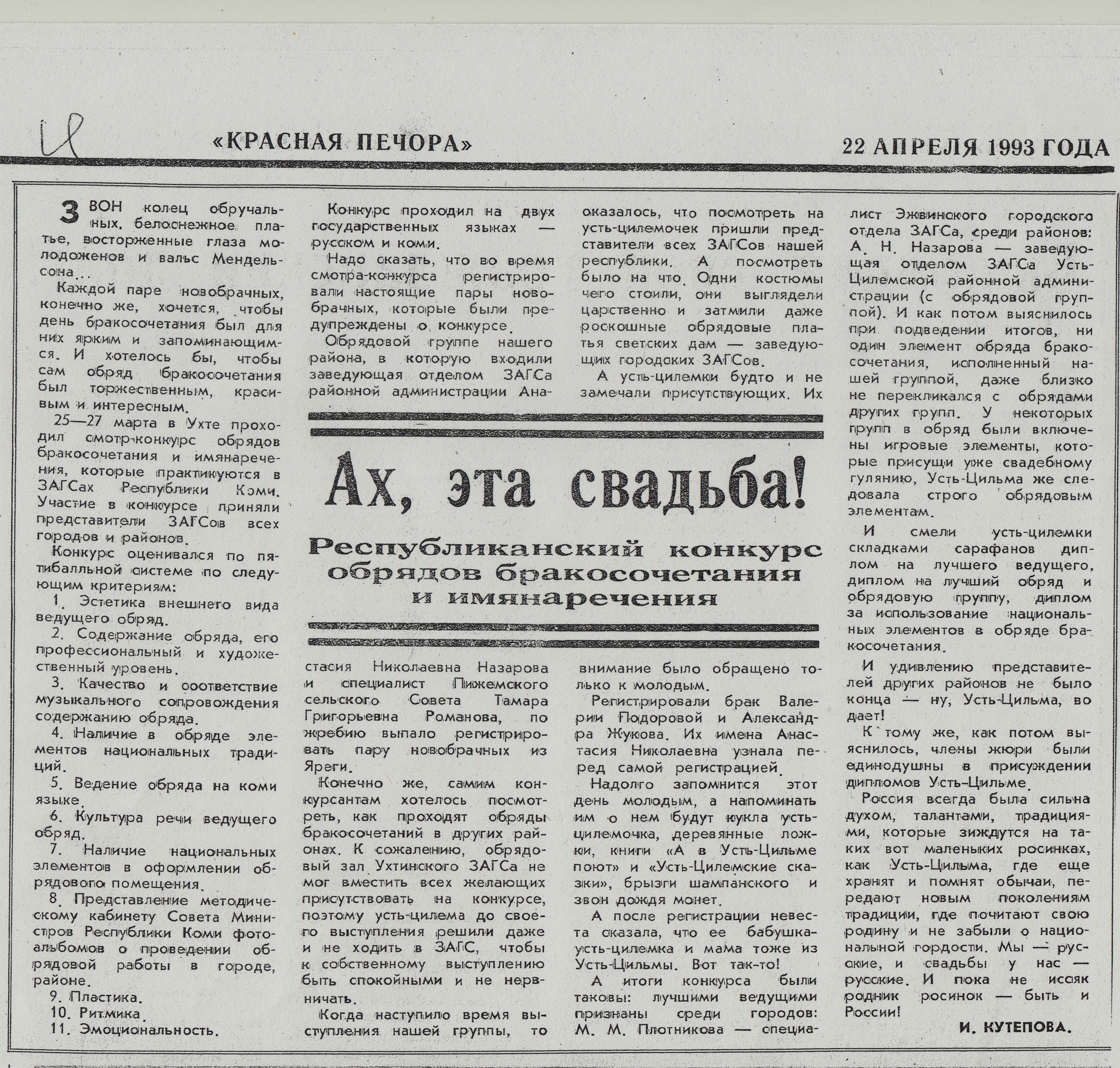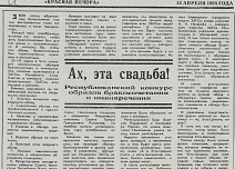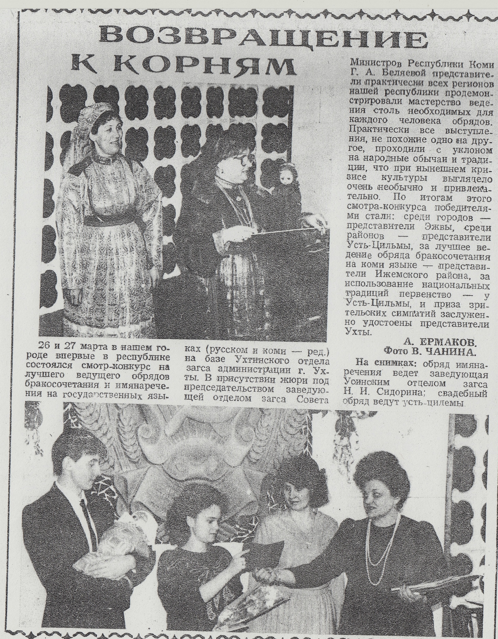 Тогда 30 лет назад в конкурс обрядов бракосочетания включили элементы народных традиций. Вот мы и взяли с собой свои сарафаны, которые смели своими складками диплом на лучшего ведущего, диплом на лучший обряд и обрядовую группу, диплом за использование национальных элементов в обряде бракосочетания. (Свою статью из «Красной Печоры» о тех событиях прилагаю фотографией).